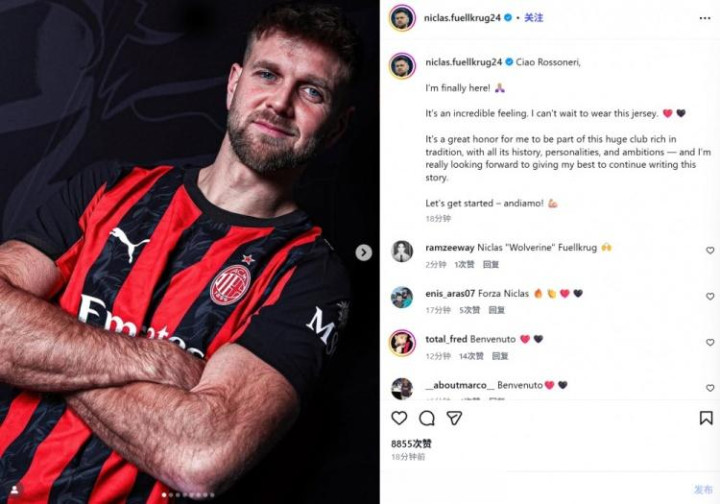 菲尔克鲁格示意:“嗨,罗森内里(红黑军团)!我终于来到这里了!这种嗅觉太棒了!我依然迫不足待地念念穿上这件球衣了。”