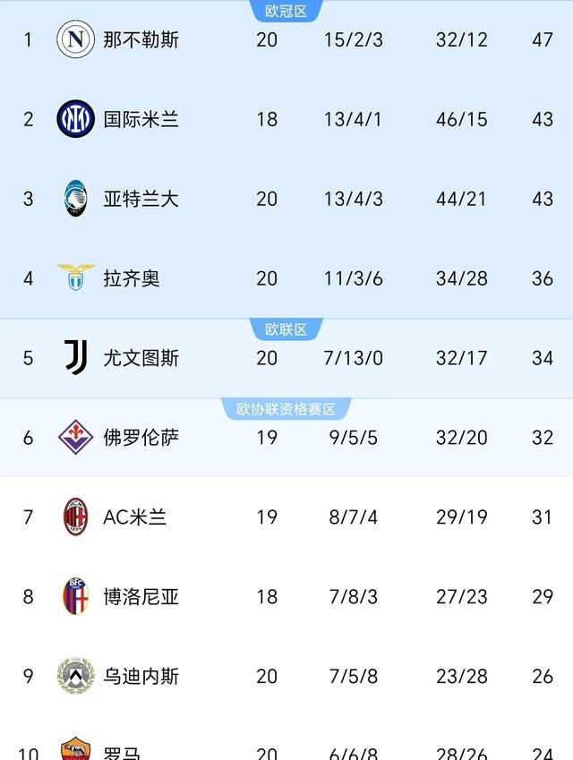 意甲积分榜概览:亚特兰大稳居前三,国米锁榜首