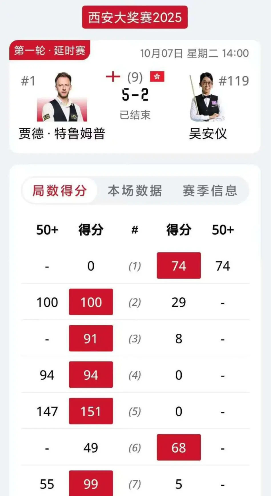 过往,特鲁姆普与吴安仪莫得交锋记载,本次比赛等于一场遇到战。而在这场遇到战中,吴安仪开场先拔头筹,特鲁姆普随后连扳四局,以4-1反超并获取赛点。其中体育录像/图片,第五局轰出单杆满分147分。最终,他以5-2驯顺吴安仪晋级正赛。